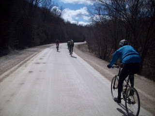saturday: 5:30 breakfast came early and identical to friday except i failed to burn the sausage. the first 12 miles were into the wind and shattered the group instantly. wes held on with kent, drew and i as we battled about a 20mph headwind and still softer gravels. a light mist was just enough to add ambiance. about 20 miles in kent broke a pedal. we planned to have support meeting us at 35 miles but i called julie and asked her to throw in another bike (bringing the decorah bicycles shop truck-thanks again travis) and necessary tools. along the way we met back up with gunner who had made a wrong turn at some point. julie caught us at about mile 30 and a quick pedal change was performed and we continued onto the sattre store for our first scheduled break. ham sandwich and blueberry pie left me feeling pretty good til we rolled away from the store into an actual rain shower. thus began the "middle 50". lots and lots of climbing, a bit of walking, drew's broken saddle, my loose brake hood, some wind, some softer gravels and increasing quiet time. the quietness brought on by the suffering was broken periodically by the ongoing argument as to the accuracy of kent's gps in terms of out total climbing (still not sure its accurate). along the way i had convinced everyone in the group that bacon was the key to endurance riding. everyone tried it, not sure everyone is truly convinced. think maybe if they would have rolled up a candy orange slice into a slice of bacon they would have fully understood the power of the precooked bacon. digressing. murderous, murderous hills especially given the conditions and their timing during the ride. rolled into casey's in ossian at mile 85 with dreams of pizza dancing in our heads. WHAT CASEY'S IN THE WORLD DOESN'T HAVE ANY PIZZA AT 3P.M.?!?!?!?!?!?!?! total bust, settled for roast beef sandwich, glazed donut and a pepsi. steve had pulled the plug following an explosive water bottle cage and some nasty back spasms so he and julie met us at the gas station. this provided an opportunity to dump camelbaks before the final 20 miles. we left ossian knowing the final 20 was back into the original headwind but it turned out to be not as bad as expected. sensing the end the pace would occasionally pick up despite kent's verbal protests. thinking he knew something we didn't as he started to fight cramps about 95 miles in. still not sure who decided to attack the final hill or who won or whose idea it was to stoplight dragrace down water street to my apt or ride the bike trail that was still ice packed when we were already over 100 miles in...but all of these decision truly seemed appropriate at the time. finished out 105 miles in just over 10 hours but was simply thrilled to have finished them